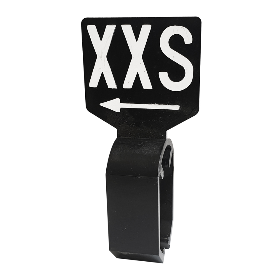 De maatbordjes zijn zwart en dubbelzijdig bedrukt met witte opdruk XXS.