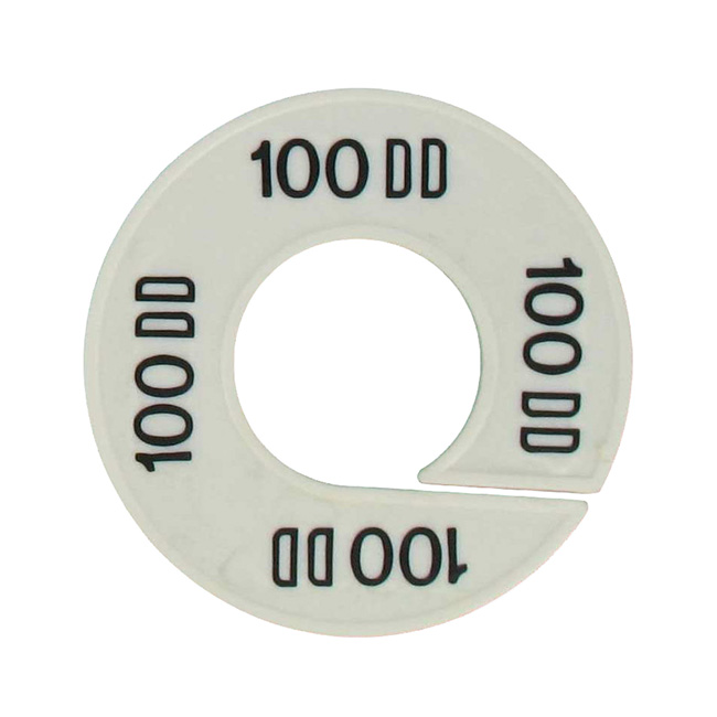 Maatschijf in het wit met zwarte opdruk voor maat 100DD.