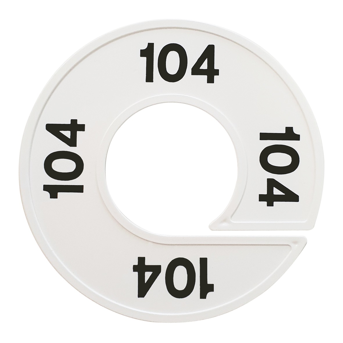 Maatschijf in het wit met zwarte opdruk voor maat 104.
