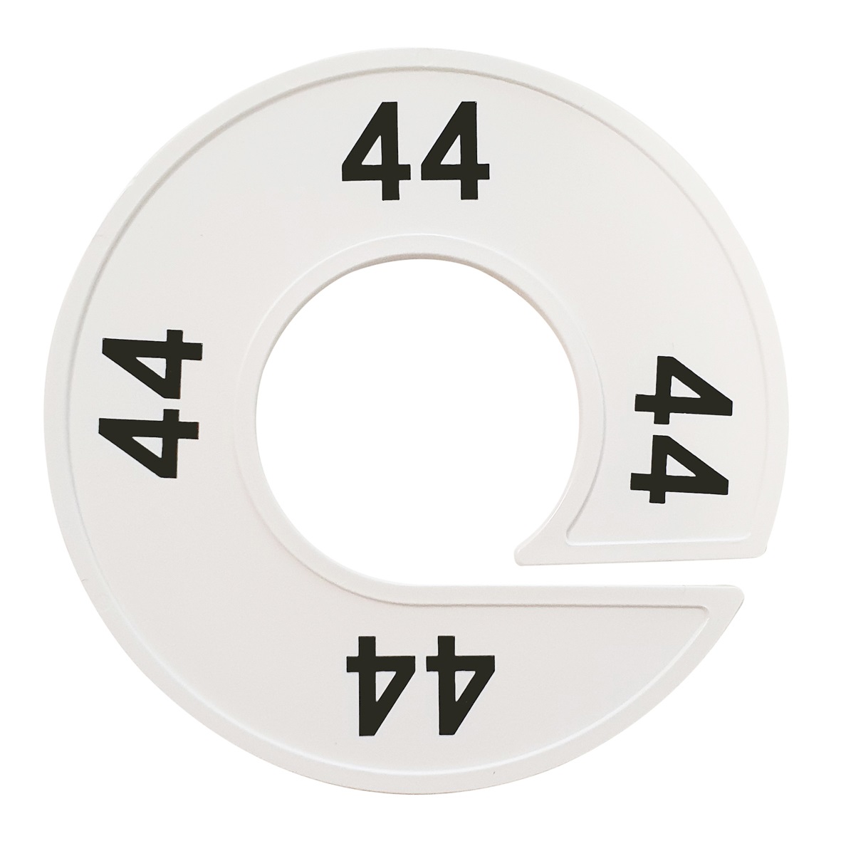 Maatschijf in het wit met zwarte opdruk voor maat 44.