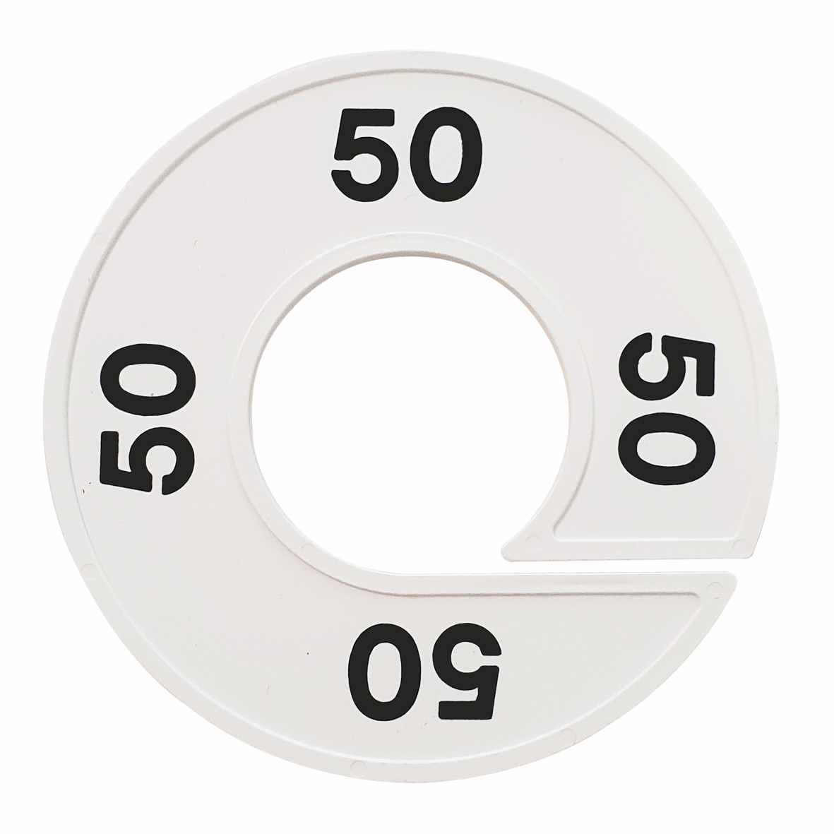 Maatschijf in het wit met zwarte opdruk voor maat 50.
