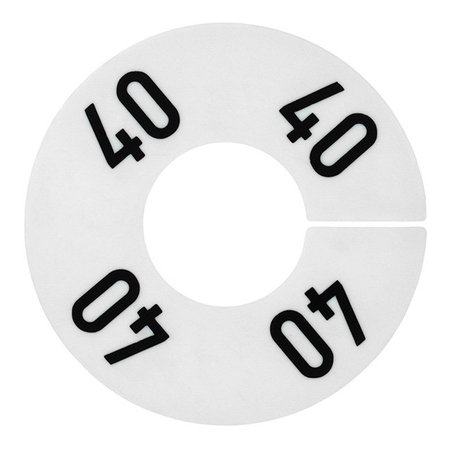 Maatring of confectiering in het wit met zwarte opdruk voor maat 40. De ringen zijn geschikt om aan een kledingrek te hangen.