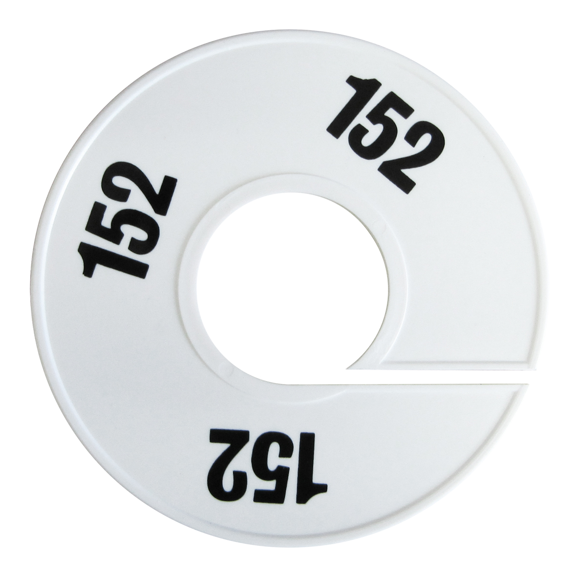 Maatschijf in het wit met zwarte opdruk voor maat 152.