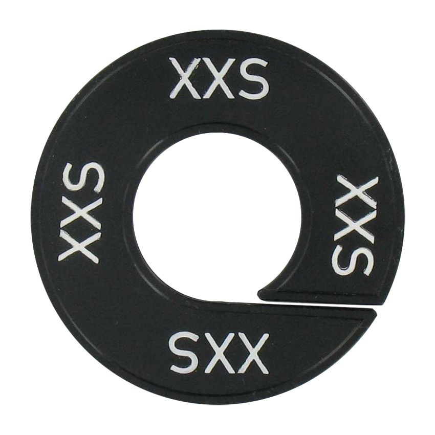 Maatschijf in het zwart met witte opdruk voor maat XXS.