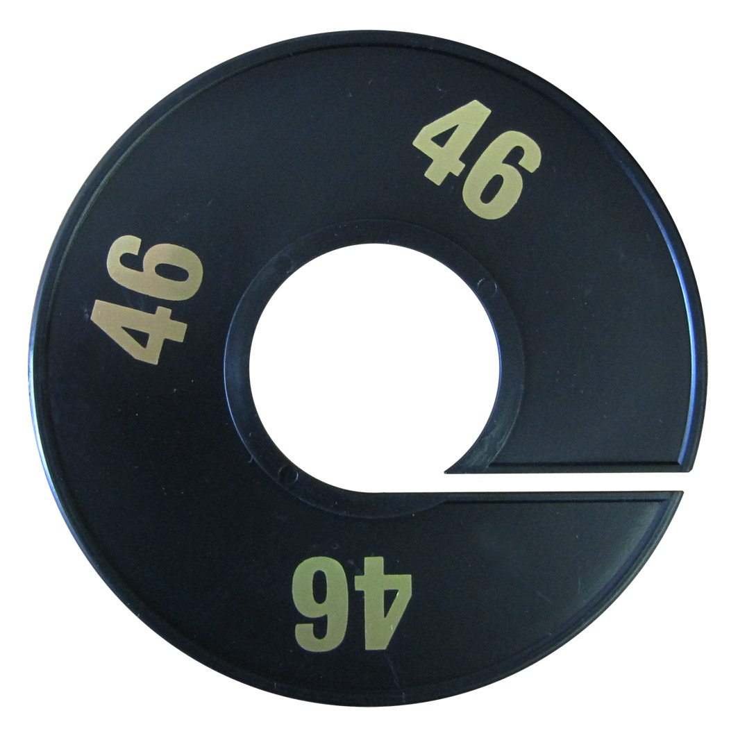 Maatschijf in het zwart met goudkleurige opdruk voor maat 46.