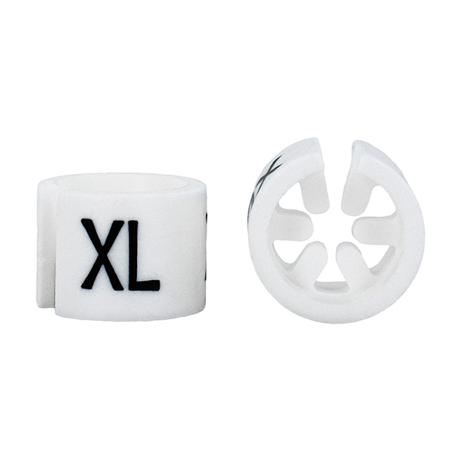 Door maatdoppen op de kledinghanger te plaatsen, is zichtbaar welke maat het artikel heeft.