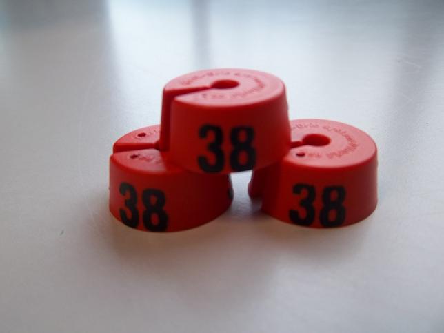 Rode MB1 maatdoppen met zwarte opdruk voor maat 38.