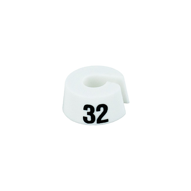 Maatdop in het wit met zwarte opdruk voor maat 32.