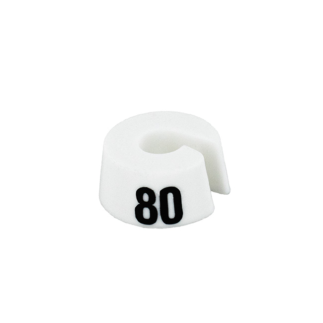 Maatdop in het wit met zwarte opdruk voor maat 84.