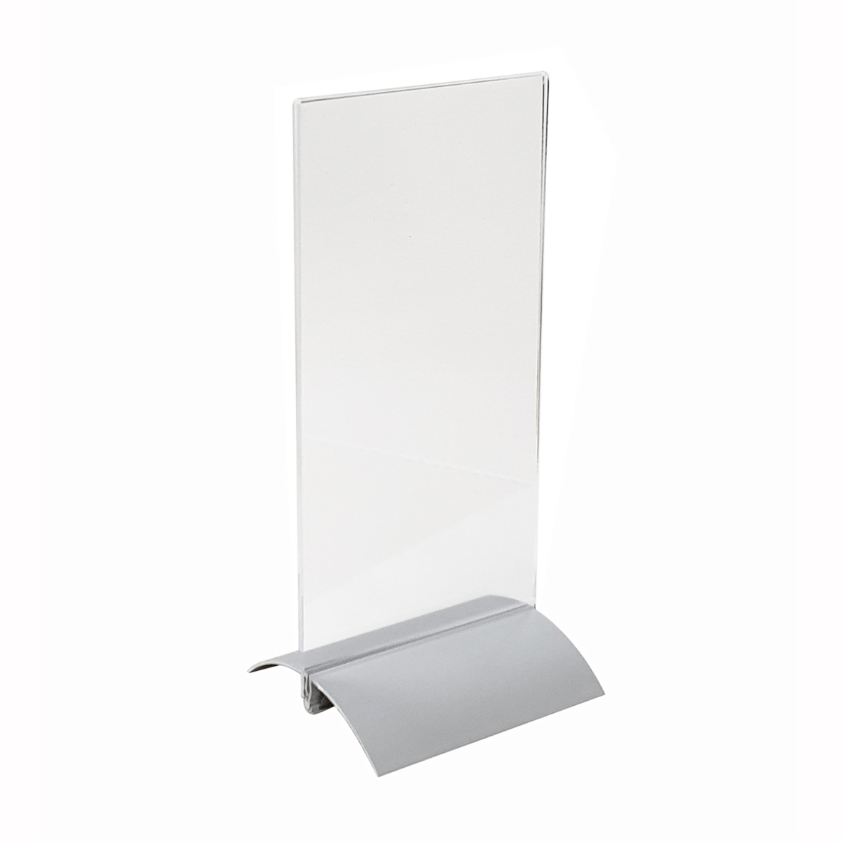 Zilvergrijze kaarthouder van 100mm breed met een transparante hoes van acryl in de houder.