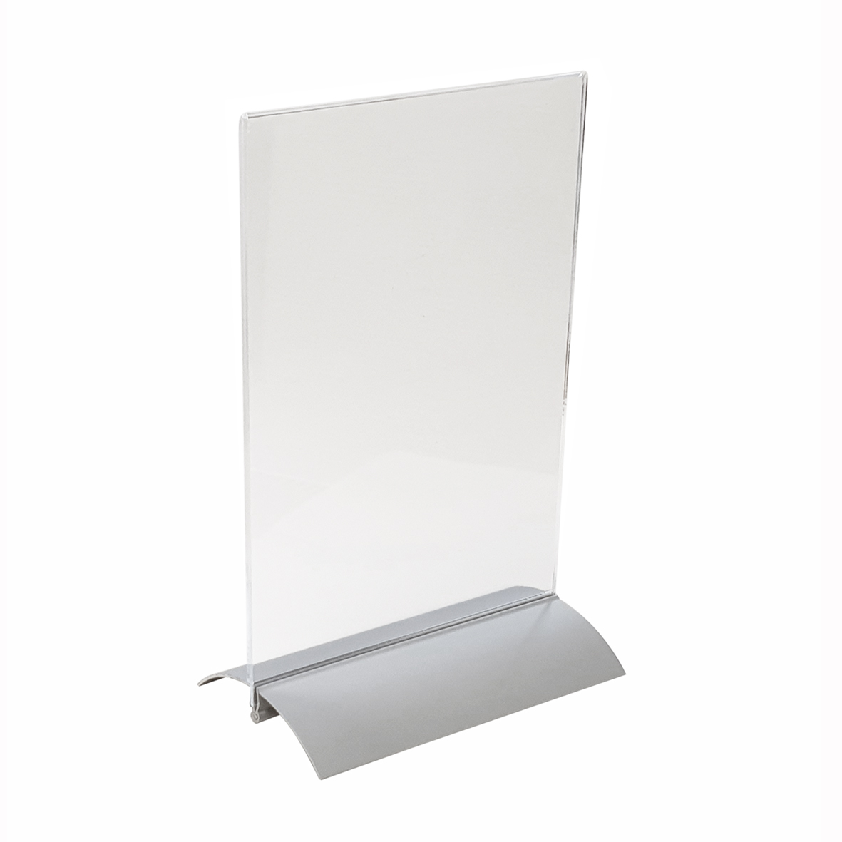 Zilvergrijze kaarthouder van 150mm breed met een transparante hoes van acryl in de houder, verticaal model.