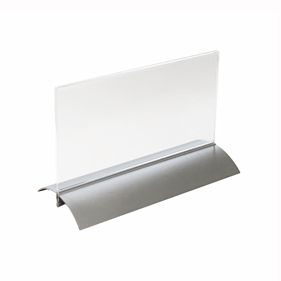 Zilvergrijze kaarthouder van 210mm breed met een transparante hoes van acryl in de houder, horizontaal model.