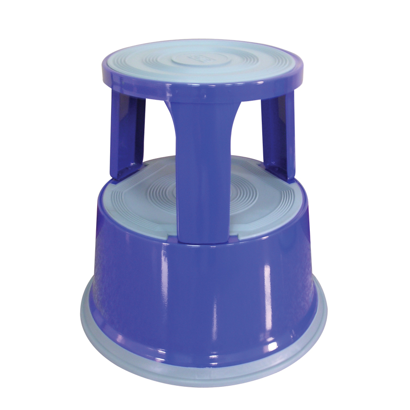 Blauwgekleurde opstapkruk van metaal met antislip op de stavlakken, per stuk verkrijgbaar.