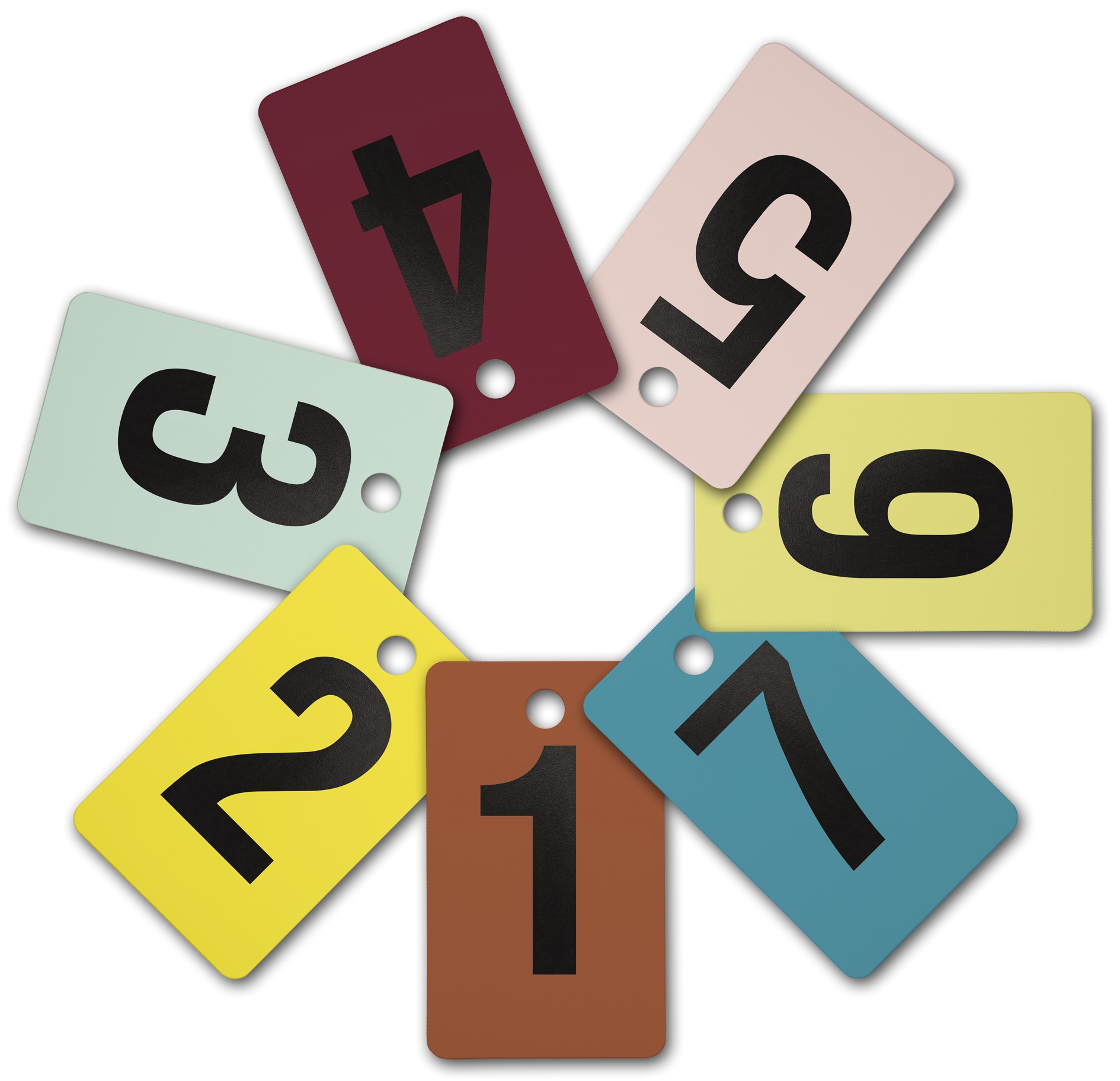 De tags bevatten de nummers 1 tot en met 7 en geleverd in verschillende kleuren.