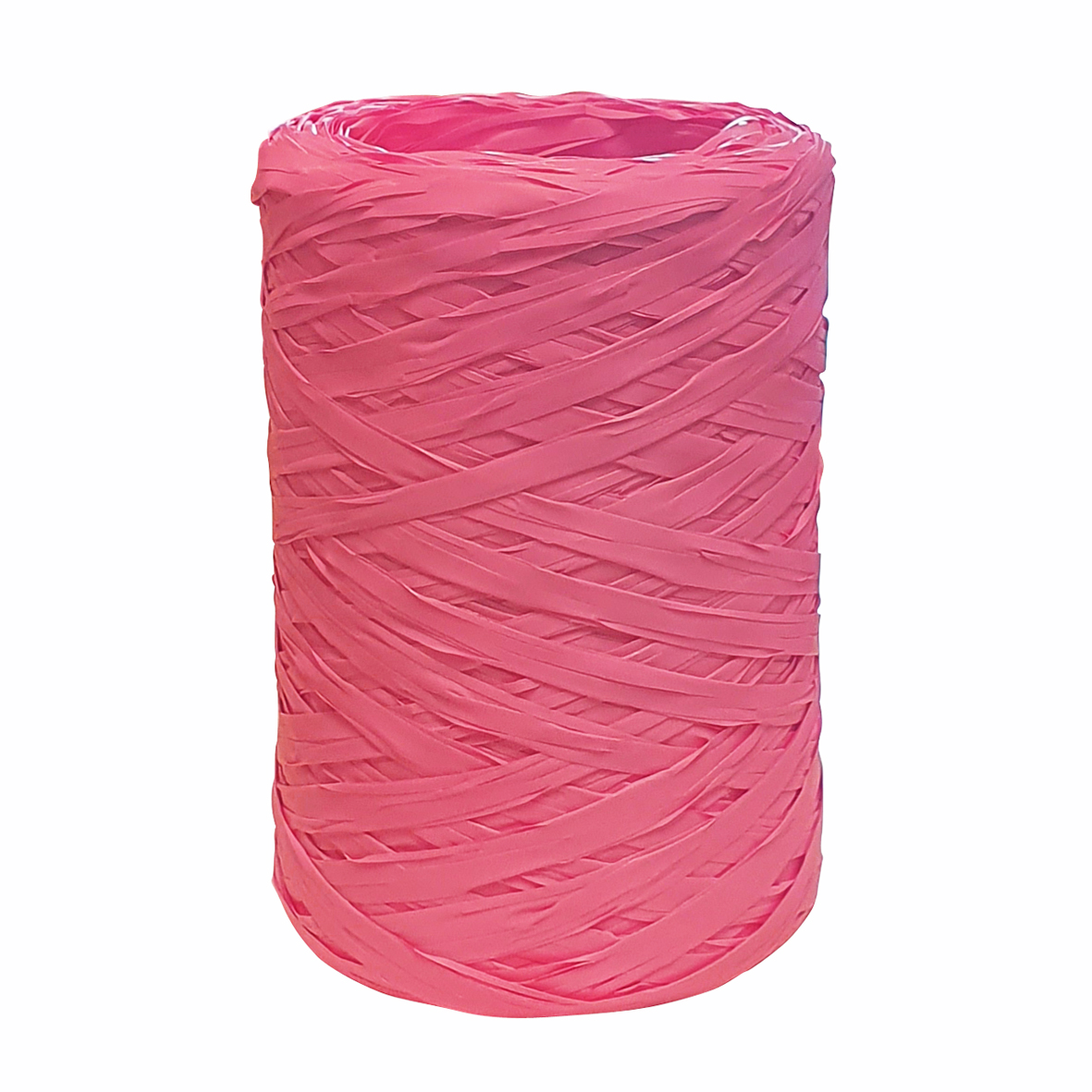 Donkerroze lint van raffia materiaal, het lint is 5mm breed en de totale lengte van de spoel is 100 meter.