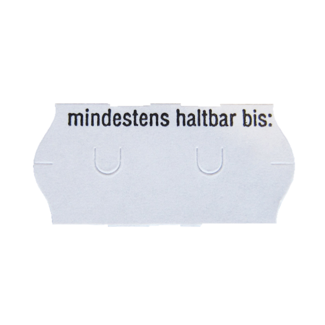 De prijstang etiketten met golfrand hebben een afmeting van 26 x 12 mm per stuk (2612 gs) en ze zijn bedrukt met mindestens haltbar bis (Duitse THT, boven in het etiket, voluit geschreven).