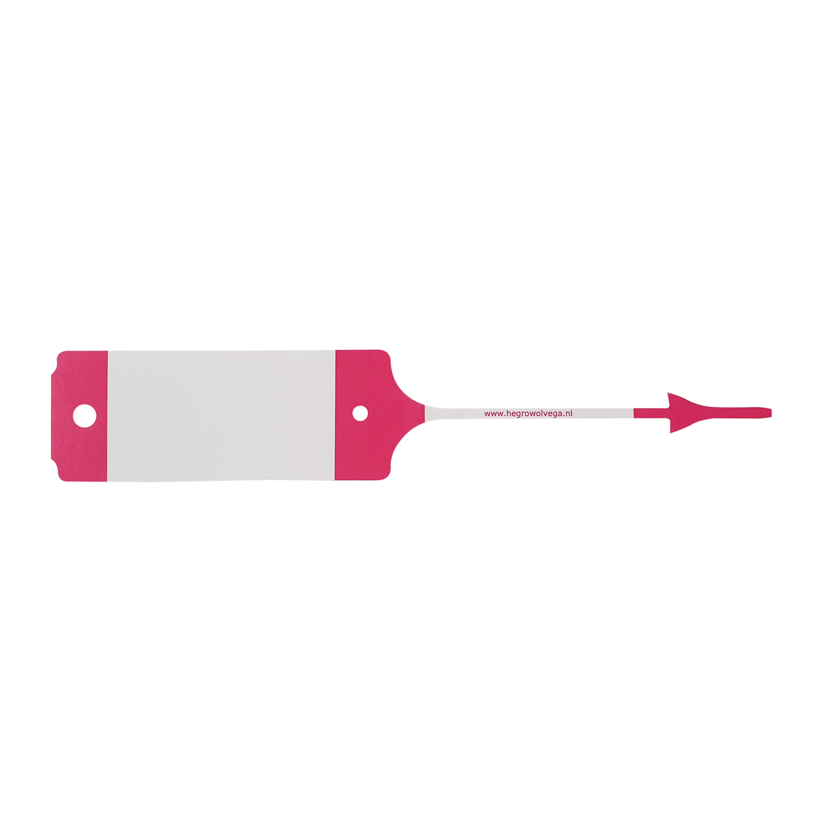 Magenta/roze/witte labels zonder bedrukking, zelf te beschrijven. Totale lengte van de labels zijn 19cm, het schrijfvlak is 7,5 x 3,5cm.