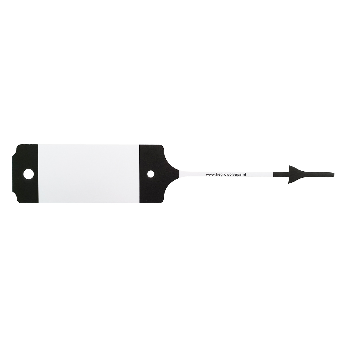 Zwart/witte labels zonder bedrukking, zelf te beschrijven. Totale lengte van de labels zijn 19cm, het schrijfvlak is 7,5 x 3,5cm.