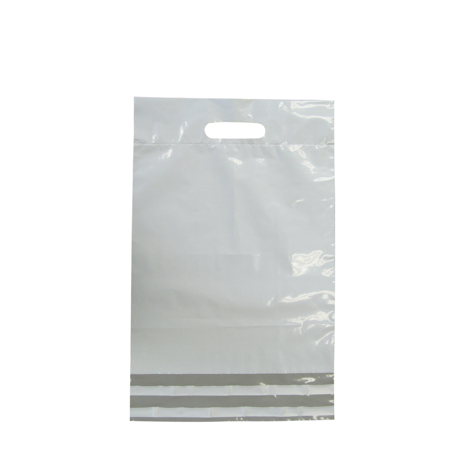 Witte verzendzakken met handvat en een formaat van 30 x 39 centimeter per stuk.