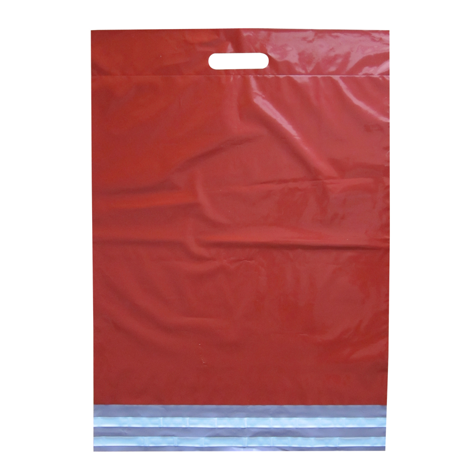 Rode verzendzakken met handvat en een formaat van 45 x 55 centimeter per stuk.