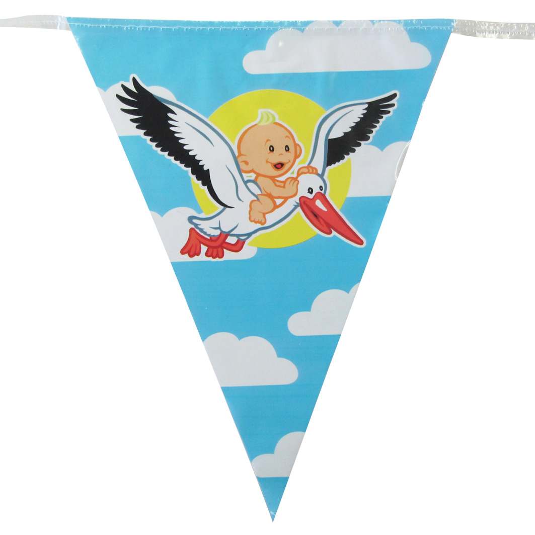 De opdruk van de vlaggetjes bevatten een vliegende ooievaar en een baby die op de ooievaar zit.